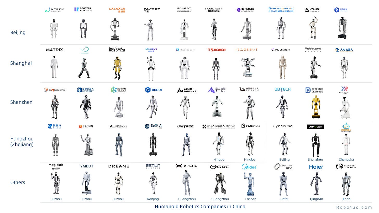 From Tuo Liu at RoboTuo: a city-level breakdown of humanoid robotics startups across the United States, Europe, and China grouped by startup density. In just four years, the industry has gone from speculative demos to a dense cluster of serious teams. (At the time, Tesla’s Bot reveal was literally a man dancing in a bodysuit.)