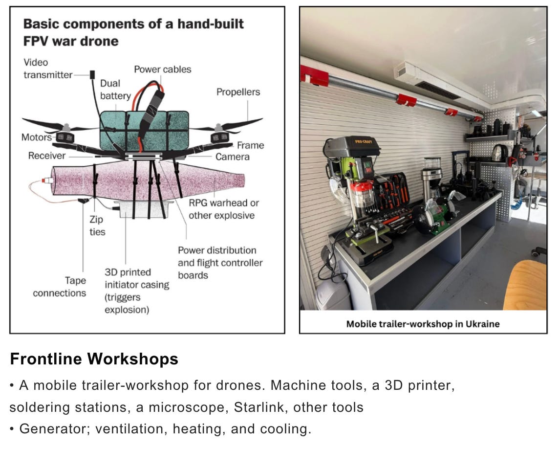 Pulled from a recent presentation by Ukraine’s Arms Monitor, this is a rare look at what modern, distributed manufacturing looks like under extreme constraints. Instead of final integration happening in centralized factories, nearly 100% of drones now pass through a new manufacturing layer known as “frontline labs”, where they’re modified and outfitted with the latest changes just before deployment.