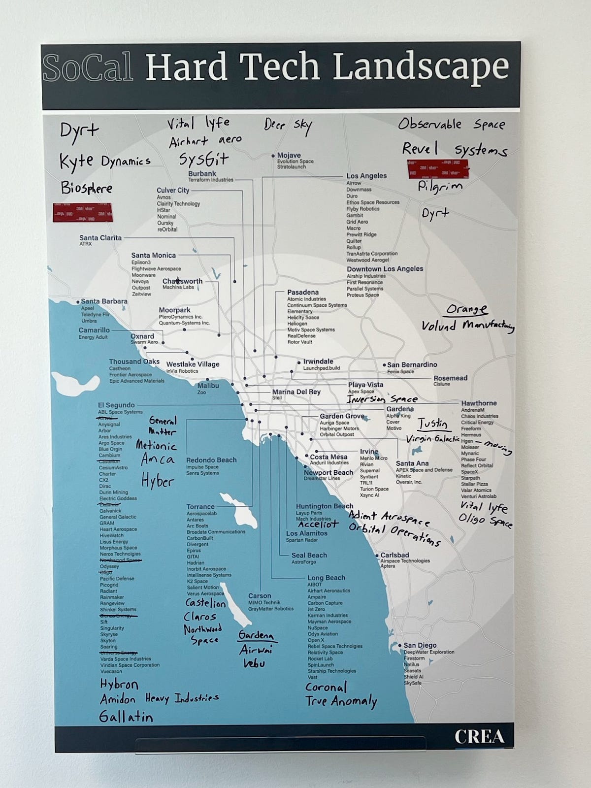 A map of every emerging hard tech. startup in Southern California. The region has the feel of late-20th century Silicon Valley, where startups cluster in the same few zip codes stacking on top of each other. Cities become magnets for talent, and the more talent they pull in, the stronger the pull gets.