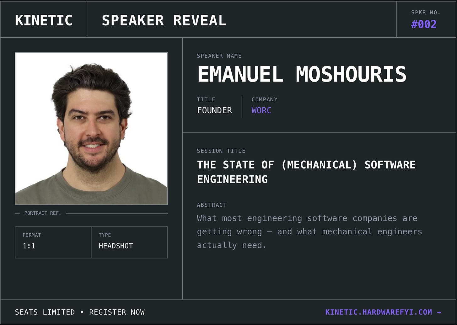 Our next Kinetic speaker is an engineer we deeply admire: Emanuel Mourish (better known as em0sh)! He’ll present The State of (Mechanical) Software Engineering, breaking down what today’s engineering software gets wrong, why it keeps missing real workflows, and what engineers actually need.
