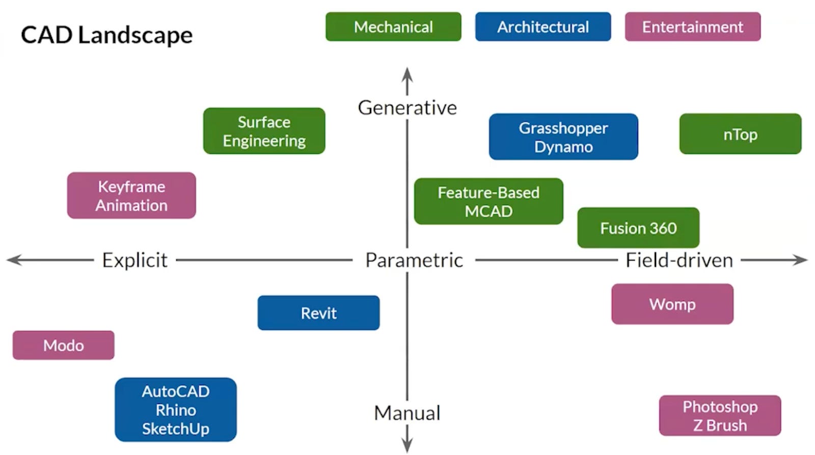 Blake Courter (former nTopology CTO, now at Gradient Control Laboratories) lays out a framework for where CAD is headed in this interview, mapping design tools along two independent axes: parametric vs. explicit modeling, and manual vs. generative workflows. These don’t necessarily travel together; parametric tools can be non-generative, or vice versa. The deeper issue he points to is data scarcity: engineering firms hold drawings and models as IP for legitimate competitive reasons, and the data that does exist is largely useless at the part level. The real unlock for AI in engineering requires translating generational knowledge into formats usable by both humans and machines. Courter’s main term is “geometry as code,” where the code is the shape itself rather than a script operating on a proprietary kernel. With implicit modeling (defined by mathematical fields rather than boundary-based surfaces), construction becomes transparent and geometry can be open-source, enabling systems to understand CAD models directly as a potential path around the data bottleneck.
