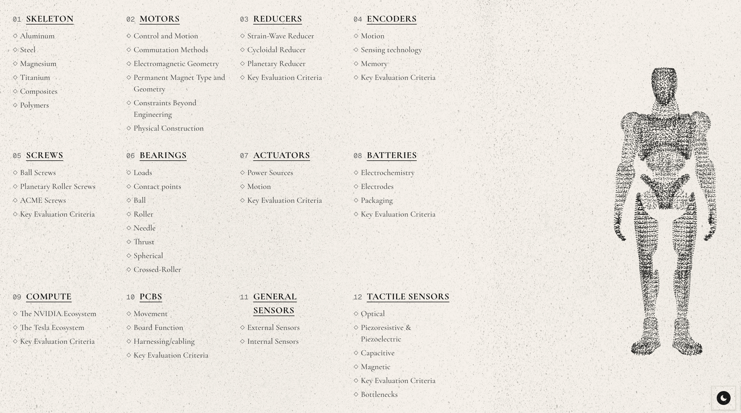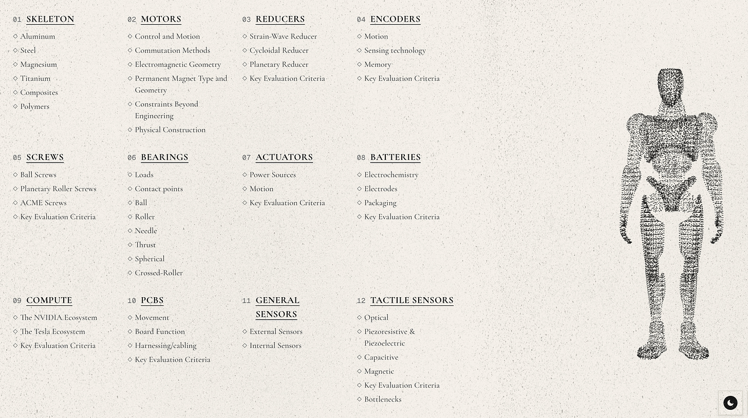 Humanity’s Last Machine is a deep dive report on humanoid hardware, starting from the components and working outward to everything they pull into their orbit across the landscape of startups, key suppliers, and geopolitics. The site itself is inseparable from the report and a clean example of what good technical research can look like (PDF version linked for offline reading). Written by investors and builders in the space, it spans everything from mechanical hardware to sensing and compute, with the heaviest attention on actuation where industry bottlenecks are most pronounced. Some gems from the report that we learned while reading: